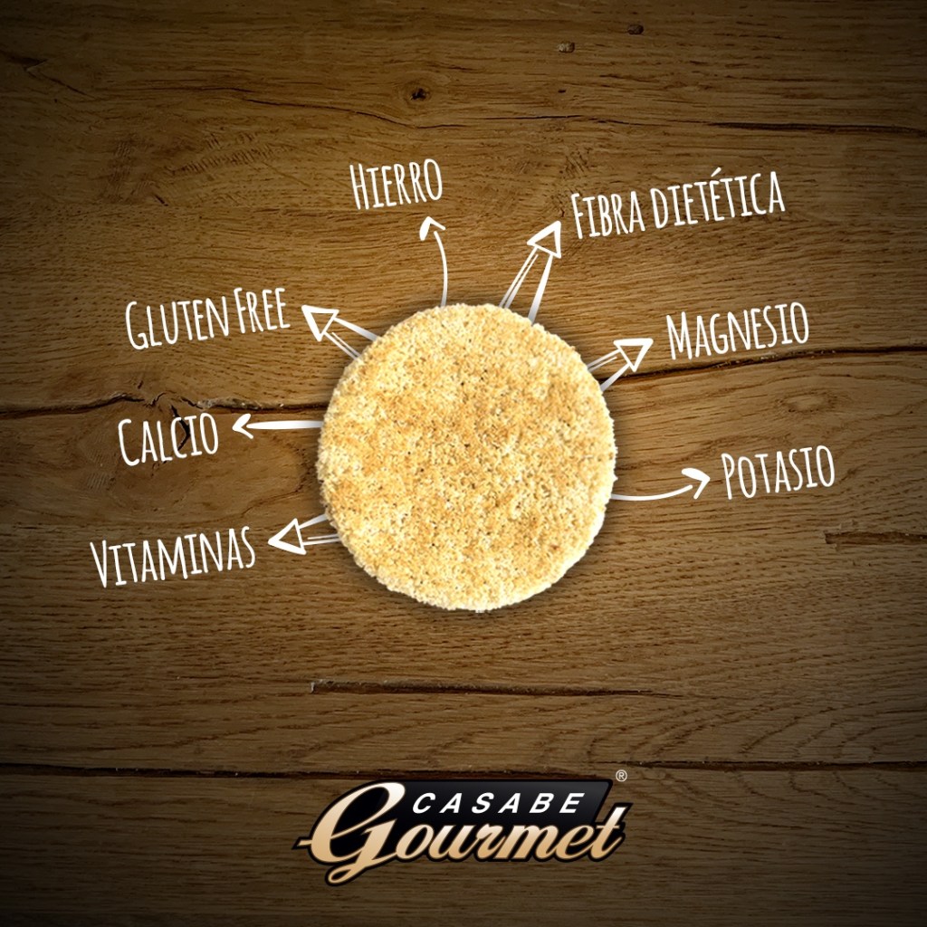 Originario de Sur America, mayormente de la selva amazónica Venezolana, este ancestral alimento, tiene más beneficios de lo que se pensába. Su nombre indígena es: CASABE, que significa: PAN DE YUCA o simplemente “PAN” es elaborado desde hace más de 8 mil años, siendo la YUCA, su único ingrediente, una vez seleccionada, se pela, se muele, se convierte en masa, de prensa y se le extrae el líquido, luego se obtiene la masa seca, se procesa y se cocina a leña en moldes. Estudios realizados, han descubierto que puede sustituir al pan tradicional, porque es una excelente fuente de energía, que no es ultra procesado, aporta 6 vitaminas b diferentes y 2 vitaminas k, magnesio, potasio y otros minerales, sin mencionar que contiene mucha fibra y cero gluten. Es ideal para ayudarte a mantener controlados los niveles de azúcar en sangre, previene el envejecimiento prematuro, te ayuda a mantener la figura, pero lo mejor de todo es que sus nutrientes, mejoran el funcionamiento de tus órganos. Tiene un sabor neutral y es bastante crujiente, así que puedes acomañar diferentes tipos de comidas con este súper alimento, si tienen la posibilidad de adquirirlo, háganlo parte de su plan nutricional…